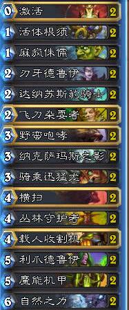 为什么一张过牌都不带?过牌等于什么?我觉得,这种极限快攻的卡组,就是在前期抢死对手,如果加入知识古树,蓝龙这些高费过牌的话,第一:让场面,第二:提高了前期卡手的概率。当然这是下限,上限是在后期缺一点伤害的时候,能够去找牌。大家可以通过自己的理解,权衡上下限来调整卡组。