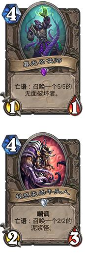 2、被感染的牛头人(423):4费23嘲讽身材,亡语出22,4费2攻实在有点低了,它作为4费随从,2攻交换随从的能力确实有点低,前中期面对3-4费随从都有点尴尬,甚至面对一个223,也有点吃力。当然他的嘲讽属性对于后期护脸护随从、和前中期随从交换优先权上有一定的帮助。总体来说,它是一张偏中等的随从牌,没有传统雪人或者森金卫士强。