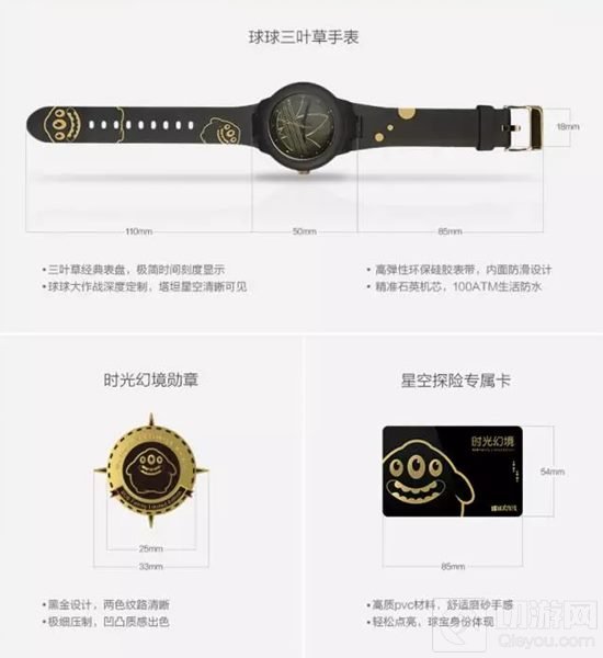 球球大作战首款跨界产品时光幻境礼盒,由球球大作战三叶草手表,时光幻境勋章、星空探险专属卡构成: