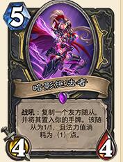 如果使用得当,暗影施法者是一张潜力无限的卡牌,甚至可以成为你的第二个胜利条件,它可以让你更好地规划手牌消耗,完成控场。一个很强的combo是,1费布莱恩+暗影施法者复制场上的大范,再打出手中的两张大范,这样就可以直接造出一张5/5和7/7,值得注意的是,这一套仅需8点法力值就可以完成。