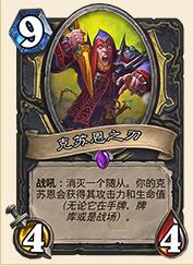 触发两次战吼的特效是很强的,这本卡组中,我们必须尽量打出布莱恩·铜须+暗影施法者,从而获得两张低费的铜须。这在之后我们通过克苏恩体系养怪的过程中会起到很大的作用,最强的是(铜须+克苏恩之刃)。