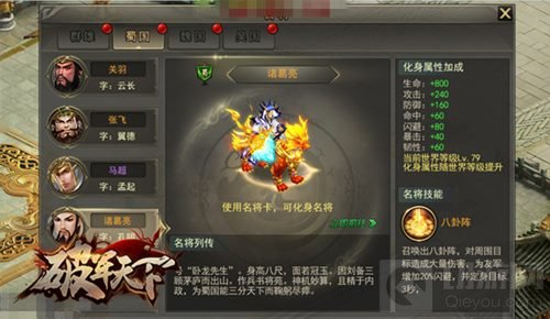 三国名将纷纷现身,千军万马混战的乱世,有他们在,没什么好担心的。破军天下手游中的名将战斗方式更像是化成最得心应手的利刃,关键时候能拉你一把,祭出最潇洒的一击,帮你对付难缠的对手,这些名将中有谋士、有战士,而名将的这些技能都是根据英雄们的特质提炼的,比如诸葛亮的八卦阵技能,是不是听起来就能逆转局势,一举得胜!