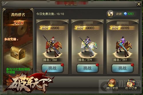 在《破军天下》手游竞技场中战斗力是最为重要的判定标准,排名就是实力的证明,挑战比自己排名高的对手,胜利后就可以顶替他的名次,与登高的快感相同,等你攀到顶峰的时候,一览众山小的时候,将是你成就自我的巅峰时刻。