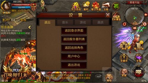 在目前版本的《全民奇迹MU》设置系统之中,第一个页签“退出”,便是能够让大伙儿从奇迹大陆上出发,自行在登录界面、服务器列表、角色选择等返回步骤中选择自己需要返回到的界面。也就是说,在设置系统“退出”页签出现之后,咱们再也不用一步一步的返回到最开始的地方了,而是可以直接去到自己需要的系统界面之中,