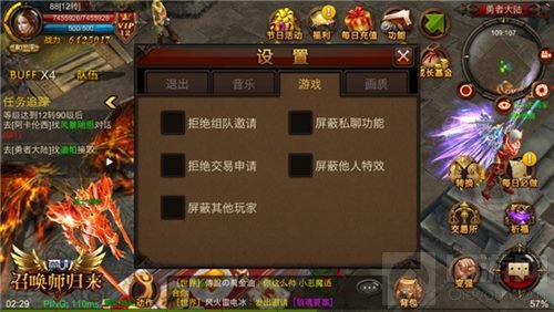 相较于其他几个功能设置,游戏性的设置才是《全民奇迹MU》设置系统的重头戏。目前,容纳了“拒绝组队邀请”、“屏蔽私聊功能”、“拒绝交易申请”、“屏蔽他人特效”、“屏蔽其他玩家”等五项开关功能的设置系统“游戏”页签,成为了勇士们想要安心刷怪单飞,拒绝一切干扰的必备首选。