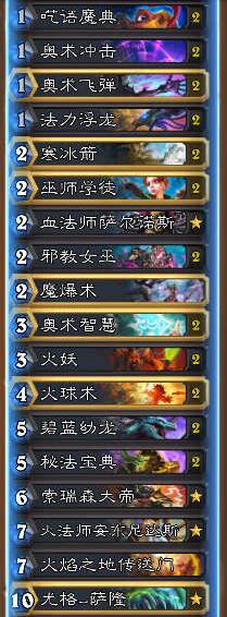 1、加入了一张魔爆术。现在天梯茫茫多的萨满,原来的火妖法是很难解决遍地的2血图腾,而法强 奥爆则能完美的返场。