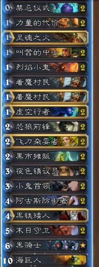 禁忌仪式:配合飞刀或者是夜色镇议员,5费后,瞬间铺满场,相当bug。