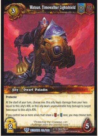 沃森特·时光行者圣盾守卫。他是第20版—守护之叛(BETRAYAL OF THE GUARDIAN)中的卡牌。不过暴雪把旧原画在炉石里做成新卡牌也不少见,想想曾贵为大元帅的闪金镇步兵吧。