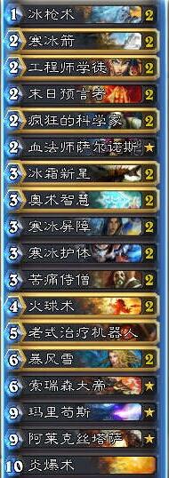 总的心得: 起手优先留科学家末日过牌寒冰箭,能上怪先上怪,场面没威胁先过牌,费用利用要合理,对冰法来说每一点水晶都是特别重要。 末日的利用要灵活,不一定是配合冰系法术清场,还可以卡节奏,抢先手,保血量等等。