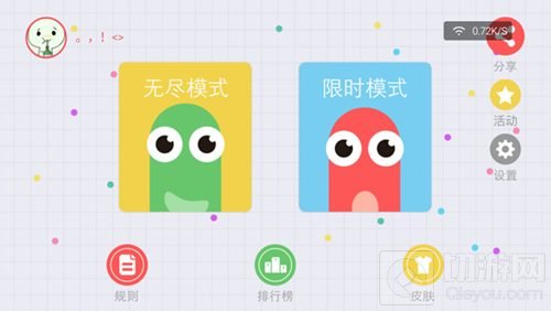 1.控制摇杆走位你的小蛇,吃掉地图上彩色的小圆点,就会变长哦。