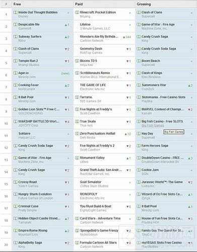 免费游戏排行榜方面,由迪斯尼推出的《头脑泡泡特工队》(Inside Out Thought Bubbles)本周继续排名第一位,而休闲类游戏《细胞吞噬》则依靠着多人游戏的趣味性飙升到了第二名的位置上。由Joycity Corp推出的二战题材游戏《军舰战争:3D第二次世界大战》则是本周免费新游戏排行榜的第三名。