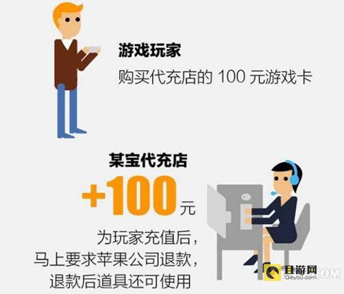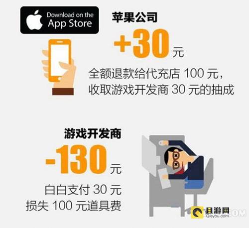 举例来说:由玩家购买代充店的 100 元游戏卡,代充店收入 100 元,为玩家充值后,马上要求苹果公司退款,退款后道具仍可使用。苹果公司需要全额退款给代充店 100 元,但它也不是吃素的,用户退款金额依旧要计入分成,即苹果仍旧需要提成 30%。在这个过程中,这个 30 元抽成+ 100 元道具的损失,就全部摊在了开发商身上。