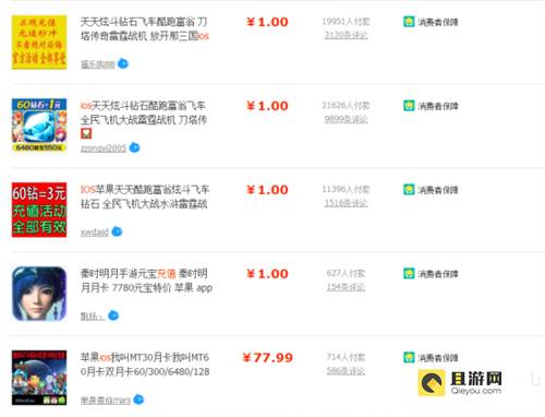 也许受到利益的诱惑,不少原本专注其他领域的淘宝店家也纷纷进入 iOS 游戏代充这一行业之中。某宝平台上为数众多的手游代充店,在不到一年的时间里轻松盈利,甚至有些已经形成了一定产业链条和“方法论”,其发展速度和规模令人咋舌。在淘宝之外,已经出现了两家专门提供手游的代充值服务的交易平台:7881 和轰轰虎。