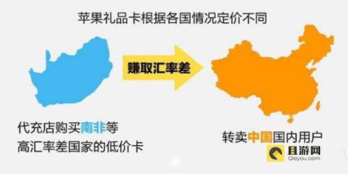 在苹果 AppStore,虚拟商品在每个国家有着相对固定的阶梯式定价,比如完成一笔内购最低额度的付费,在美国、在中国、在南非,实际付出去的货币价值在三国国家并不是绝对等号关系,因此中国的淘宝店主们开始大肆采购低额度国家的礼品卡来为国内用户充值、赚取这个汇率差。 据媒体报道,2014 年 8 月 22 日仅一天时间里,淘宝上一家苹果业务代充店共售出 351 张面值“4000 南非兰特”的 AppStore 苹果礼品卡,以单张1800 元人民币计算,一天流水 63.18 万元。