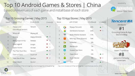 不仅腾讯的欢乐斗地主成为5月最盈利的游戏,而且腾讯的应用宝(Myapp)超过360的手机助手成为最安全的应用商店。Happy Elements的Anipop发布更新后,收入和安装量也有所上升。Supercell的部落战争在营收方面上升七位,排在第8位,也是列表中除了Minecraft以外惟一一家西方企业。