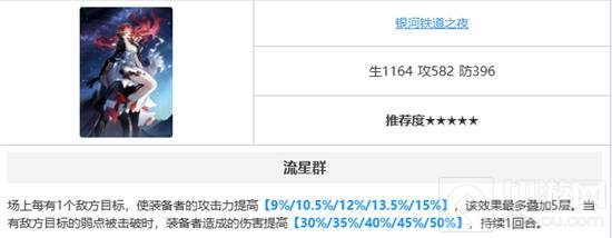 - 流星群场上每有1个敌方目标,使装备者的攻击力提高【9%/10.5%/12%/13.5%/15%】,该效果最多叠加5层。