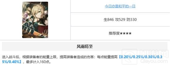 - 风雨将至进入战斗后,根据装备者的能量上限,提高装备者造成的伤害:每点能量提高【0.20%/0.25%/0.30%/0.35%/0.40%】,最多计入160点。