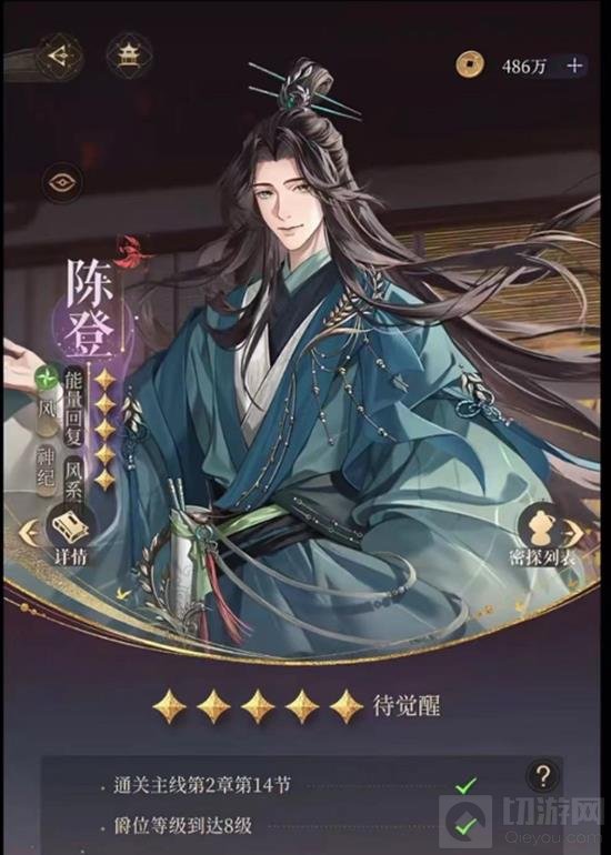 《如鸢》中的陈登是一名紫卡级别的密探,主要扮演辅助角色。拥有给阵容恢复能量的特点。