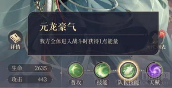 队长技能:“元龙豪气”,我方全体进入战斗时获得1点能量。