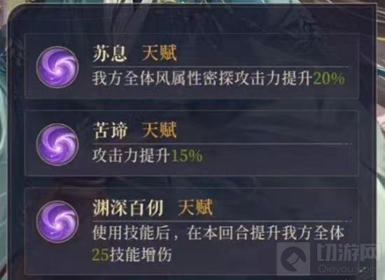 渊深百仞:使用技能后,在本回合提升我方全体25%技能伤害。