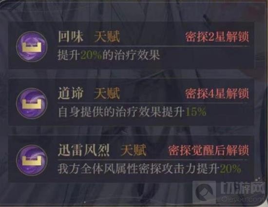 解析:史子眇的天赋机制同样优秀,不仅有提升治疗效果,还有自身回复与全体风属性密探增伤,可以说在后期,他的作用也是非常大的,这点与颜良非常相似。