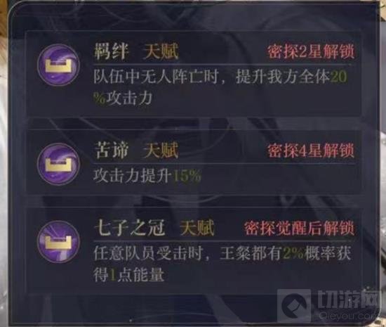 解析:王桀的天赋非常优秀,同时增攻击的同时,还有概率获得能量,这也意味着他的上限非常高,就算是到了游戏大后期的程度,他的强度也不弱。