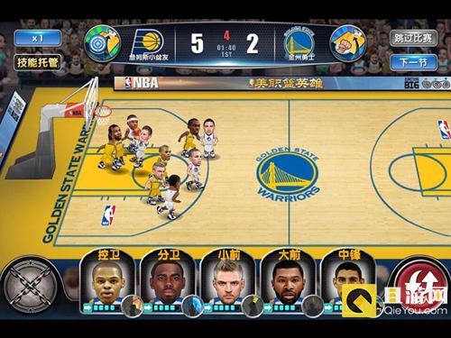 屏幕下方一排是球员技能框,等到能量蓄满,就可以随意释放,如果嫌麻烦,左上角还有技能托管自动释放。由于嫌比赛时间较长,玩家可以选择右上角的跳过中间的比赛直接进入最后一节,也可以加速比赛的时间进程来节省时间。中间还能叫停比赛换人,以换下体力不足的球员。