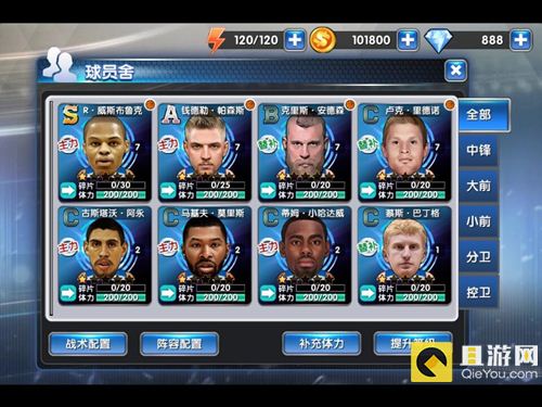 在球员系统设定阵容配置,可以选择上场的球员,十级之后还能开启战术配置。由于刚进游戏,所以都还是一星的球员,球员可分为S、A、B、C四种品质,当然S是最好的,以此类推,基本上C级的可以作为替补来用。根据正规比赛的原则每个球员都有最适合的位置,分为中锋、大前、小前、分卫、控卫5个位置,不适合的位置球员无法上场,部分球员有一个副位置可以兼任。
