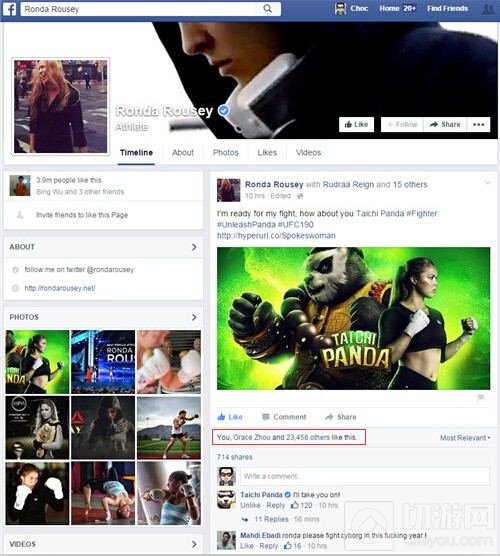 龙达·鲁西在粉丝专页发表与《太极熊猫》代言合作
