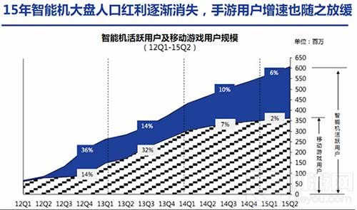 数据显示,截至至2015年Q2,中国智能手机活跃用户已达到6亿。移动游戏用户也已经突破3.5亿。但15年智能机市场日趋饱和,大盘人口红利逐渐消失,手游用户增速也随之放缓。