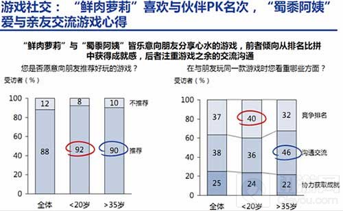 “鲜肉萝莉”相互间的竞争性更强,较为热衷于PK排名;而“蜀黍阿姨”更注重游戏之余的交流沟通,不过两者都很乐于向好友推荐游戏,适合游戏传播。