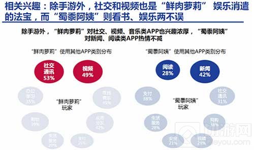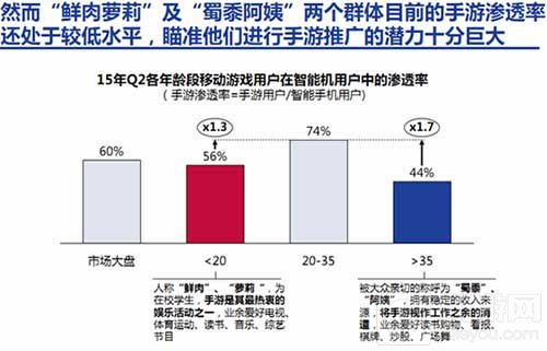 然而,“鲜肉萝莉”以及“蜀黍阿姨”两个群体的渗透率还处于非常低的水平。两个群体具有十分巨大的手游推广潜力。