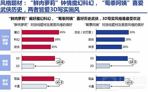 而游戏题材其实与文化变化有关。受到海外文化冲击,“鲜肉萝莉”对于魔幻科幻题材倍感兴趣,而“蜀黍阿姨”受到以前传统武侠文化的熏陶,钟爱历史武侠题材,而3D写实风格也越来越被看重。