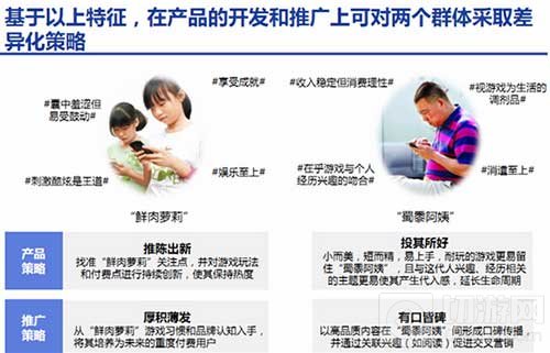 对 “鲜肉萝莉”产品要不断创新,刺激玩家消费,培养玩家付费习惯。对 “蜀黍阿姨”产品则要关注其手游的消遣娱乐功能,注重口碑传播的力量。