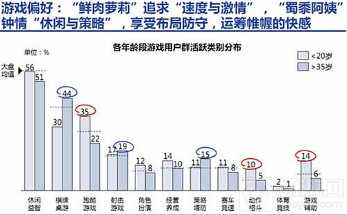 从游戏类型偏好上,也可以看出与上文相对应的特点。“鲜肉萝莉”偏好跑酷竞速格斗等能够直接与好友竞争的刺激题材,而“蜀黍阿姨”更钟情于节奏缓慢一些,讲究智慧谋虑的游戏类型。