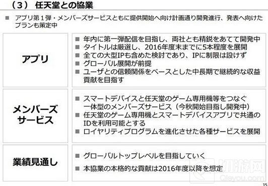 此外,守安功社长还谈到了与任天堂合作开发的手游将会按照当初预定的时间推出。对于岩田聪社长的逝世,他也表示出了遗憾。今后一定会实现与岩田社长的最后计划,展示出成果。今年内会有一款手游推出,计划到2016年末再推出5款作品。