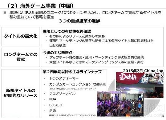 收益率较高的国内游戏事业相比去年同期出现减收状况,2015年3月期(2014年4月~6月)之后,向中国投入的几款新作手游收益不错,目前呈增收状态。另一方面,随着手游市场的潮流变化,各类研发相关费用的提升,使得游戏整体运营、管理费用都较前年同期有增加。