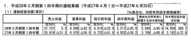 最后,社长还公布了2016年3月通期(2015年4月1日~2016年3月31日)的财报预想。收益额为745亿(同比增加3.7%),营业利润为106亿(同比减少29.2%),最终利益为64亿日元(同比减少30.8%)。