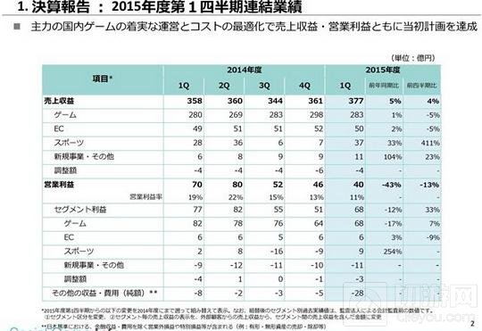 近日,日本DeNA在东京本部召开了新一季度的财报发布会,公布了2016年3月期第1四半期的财报(2015年4月1日~6月30日)。销售额为377亿日元(同比去年同期增加5.3%),营业利润为40亿日元(同比减少42.5%),税前纯利润为45亿日元(同比减少32.8%),最终利益为20亿日元(同比减少45.6%)。