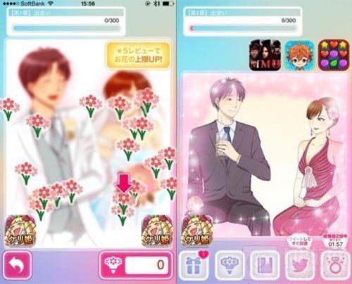 本作只有单纯的一条故事线,游戏中每隔一段时间会出现花束,送出花束即可积累经验值,故事也会继续前进,如果点击画面右下方会获得2倍的经验值,然后画面会闪瞎狗眼,因为有各种秀恩爱的场景。如此狗血的游戏设定,也只有岛国人民才会开发的出来。