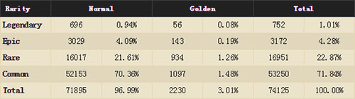 史诗:普通3029 占比4.09% 金色143 占比0.19% 总计 3172 占比4.28%