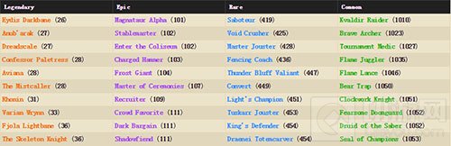 黑暗邪使艾蒂丝(仅仅只有26张,是最多的冰吼的一半),阿努巴拉克,恐鳞,神官帕尔崔丝,艾维娜,唤雾者伊格瓦尔,罗宁,瓦里安·乌瑞恩,光明邪使菲奥拉,骷髅骑士