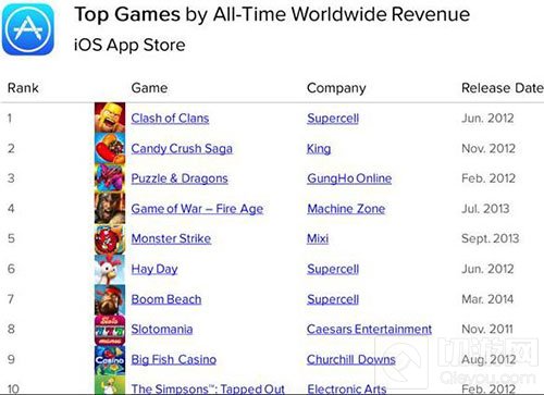 App Annie于今天发布了iOS游戏和应用自2010年以来的完整数据对比,该报告数据显示,Supercell的《部落冲突》是五年来累计收入最高的iOS游戏,King的《糖果传奇》居其次,GungHo的《智龙迷城》第三,策略类游戏占据收入榜单的比例最高,占到了30%。
