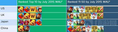 App Annie还对手游的使用率进行了统计,结果发现高收入手游的使用率也比较高(这里的使用率按照MAU来计算),高收入手游在美国、英国、中国和日本四个地区MAU榜单排名也比较高,比如《部落冲突》和《糖果传奇》。