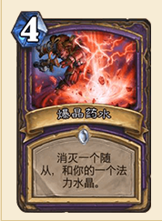 术士的这张硬解我还是想要提一下的,在王牌被削弱成5费以后,宇宙术的带王牌用起来并不十分舒服。只有一个虹吸的宇宙术有时候真的面对对面的大怪真的很尴尬,有时候被迫用扭曲虚空作为单解。爆晶药水在中后期78910费的时候,对节奏的影响并不明显,然而在前期你也并不会需要用这张硬解去去除什么大的威胁,你就当抽到虹吸或者王牌卡手了一样,真当遇到什么丧心病狂做了超级大范的盗贼你丢个水晶解了他总比被他2脚踢死要好吧。