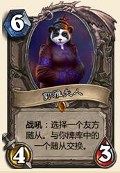 果然是熊猫人,听名字就很有古典武侠风。熊猫人一向喜欢把人扔来扔去的,这次也不例外,这卡的妙用非常多,挽救残血随从,回手强力战吼随从,让手牌的大家伙直接登场。不过呢,6费4-3的身材太弱了,太容易被解,而且非常吃牌序,随机性也太大,比如手牌一个弗丁一个城管,结果6费上她好死不死把城管扔了上去,一定节奏全无,亏大发了。