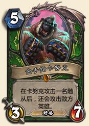 打随从顺带打英雄,这不就是江湖失传已久的隔山打牛吗?这卡直接让人想起了眼睛蛇射击,不过同样是5费,一个3-7的野兽站场比单纯的打3+3的眼镜蛇射击不知道要高到哪里去了。难道这次猎人真的可以有橙卡可用了?