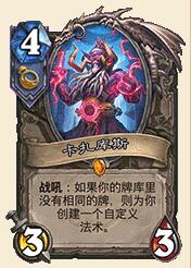 暗金教橙卡,只有法术牧可带。这卡非常好玩,宇宙流必备,现场自己印卡,感觉一定倍爽儿。许多朋友可能不知道自定义法术是什么意思,都有什么。现在给大家说一下,印卡分三步,第一步,选择费用,有1、5、10费三种选择,第二步,选择该费用的第一个法术效果,第三步,选择该费用的第二个法术效果,然后一张新卡就出炉了。貌似自定义法术卡都比较强,小编已经决定新版本上线要先合成这个有趣的家伙。