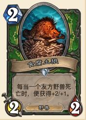 用处很多,配合11打2,鼠群+1攻多召唤1只,驼运科多兽+1攻多打1血。为什么只带一张?防止卡手,裸下微亏。