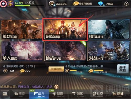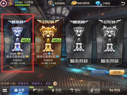 报名后,在活动时间内,点击游戏首页“战斗”按钮,进入战斗页面点击“冠军杯赛”中金币报名的“精英杯(40人)”参与比赛。